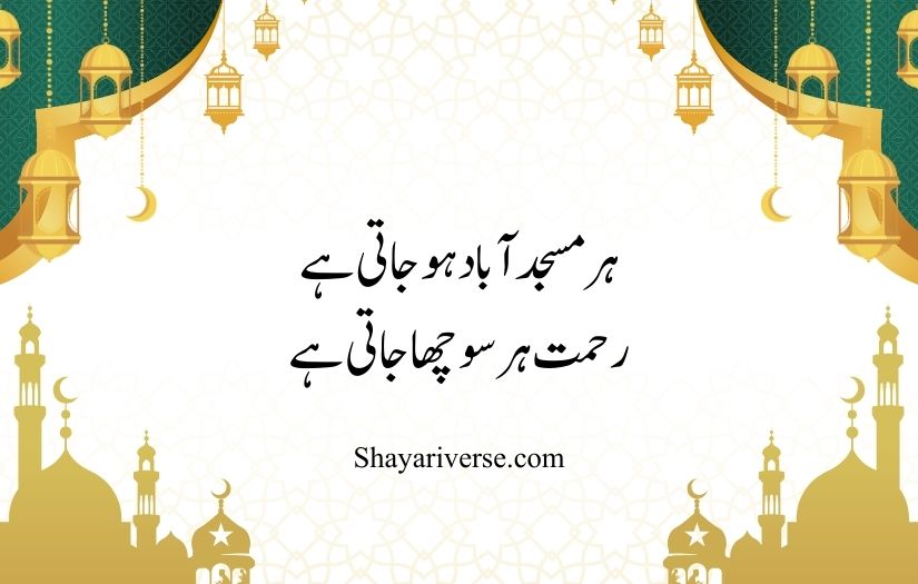 Ramzan poetry in Urdu beautifully expresses the spiritual atmosphere, peace, and blessings of the holy month of Ramadan. It reflects feelings of devotion, patience, and closeness to Allah, highlighting the importance of fasting, prayer, and self-discipline. These poetic lines capture the نور (light) and رحمت (mercy) that fill hearts during this sacred time.