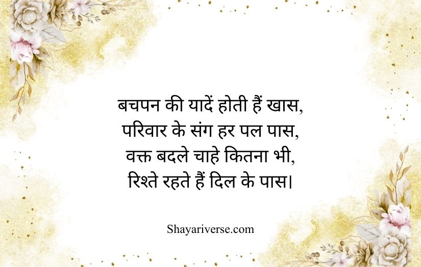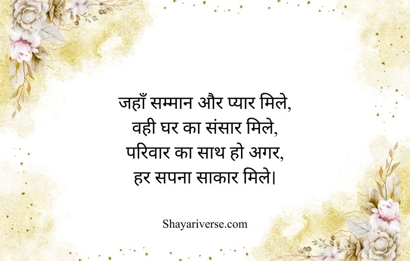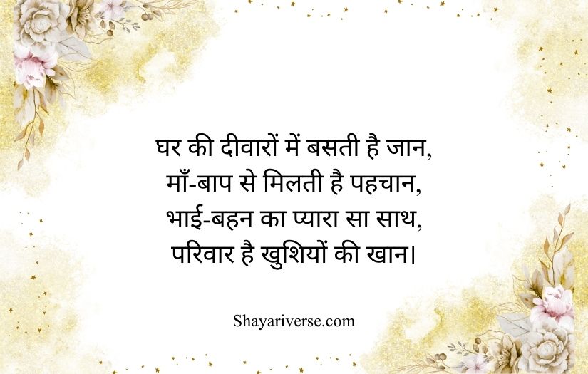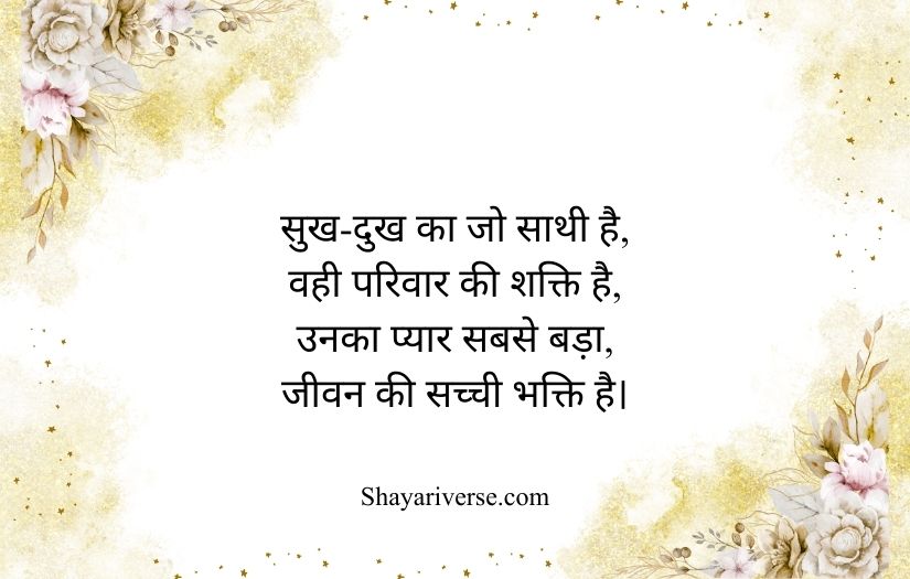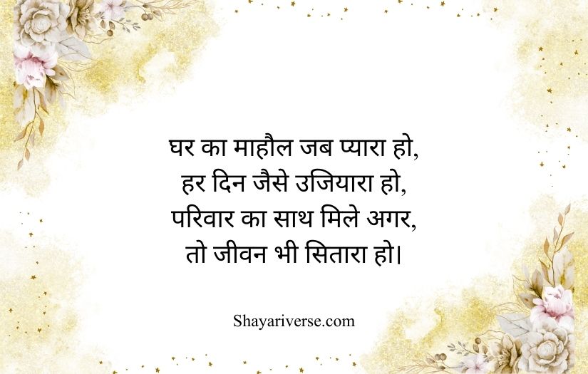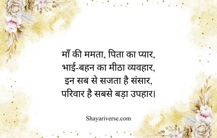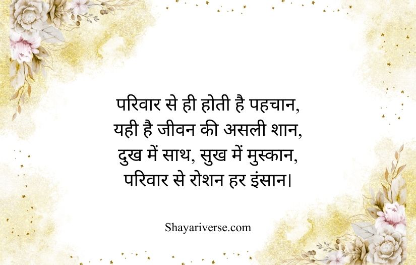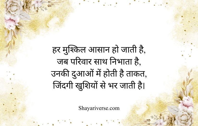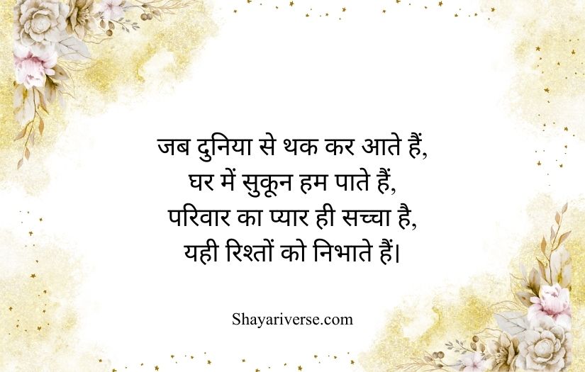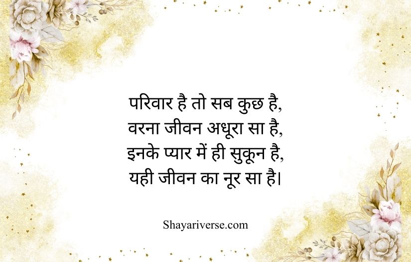 Family shayari in Hindi beautifully expresses the love, unity, and emotional bond shared among family members. It highlights the importance of relationships built on care, trust, and togetherness. These poetic lines capture the warmth of a home where every member supports and understands each other.