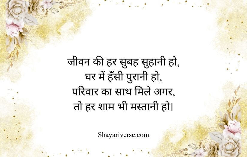 Family shayari in Hindi also teaches the value of respect, gratitude, and staying connected with loved ones. It encourages people to cherish their relationships and not take them for granted. These meaningful verses celebrate the beauty of family and inspire a deeper appreciation for those who are always there for us. Happy Family Shayari in Hindi | Joint Family Shayari in Hindi | Middle Class Family Shayari in Hindi | Good Morning Family Shayari in Hindi