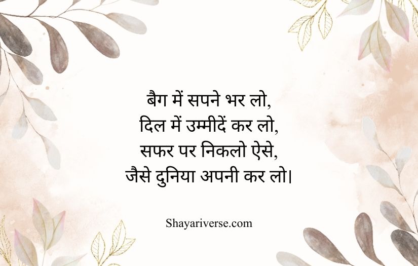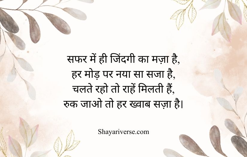 Travel shayari in Hindi also carries deeper meaning about life’s journey. It teaches that life itself is like a سفر (journey), full of lessons, changes, and growth. These verses encourage people to embrace new experiences, stay curious, and find happiness in every step of their path. Deep Travel Shayari in Hindi | Travel Shayari in Hindi English | Heart Touching Travel Shayari in Hindi | Short Travel Shayari in Hindi