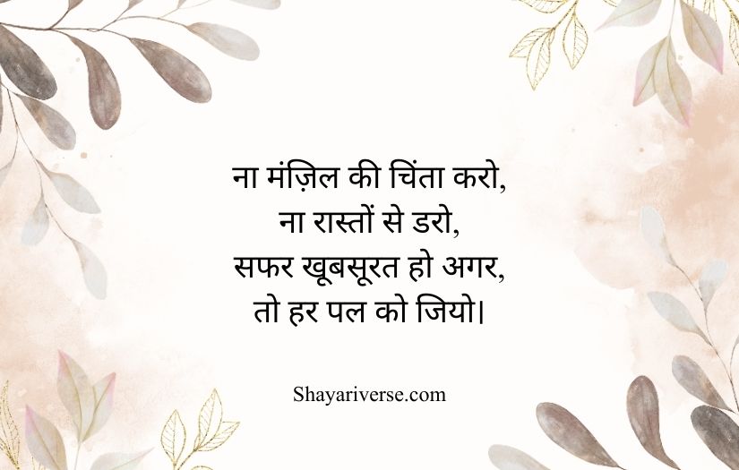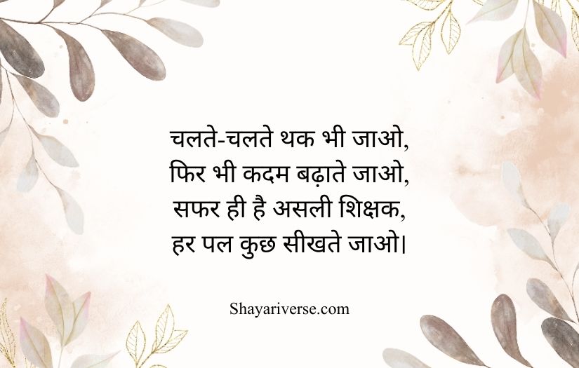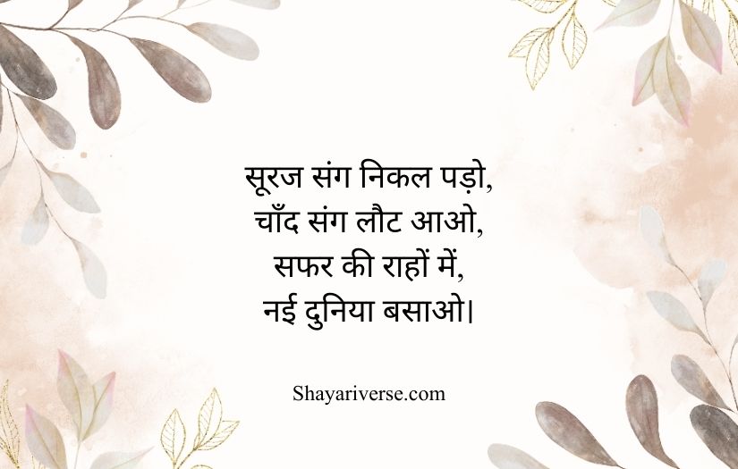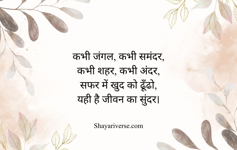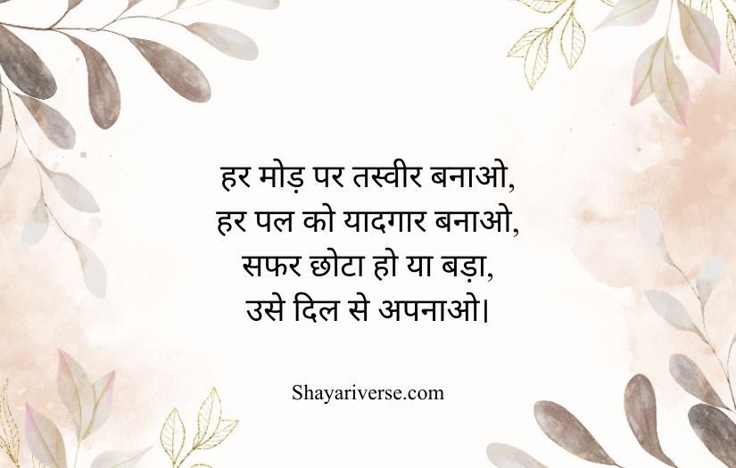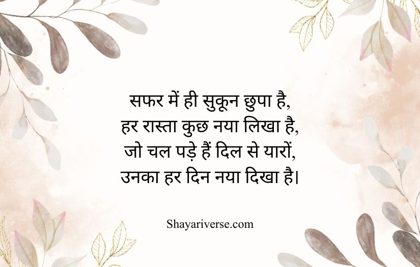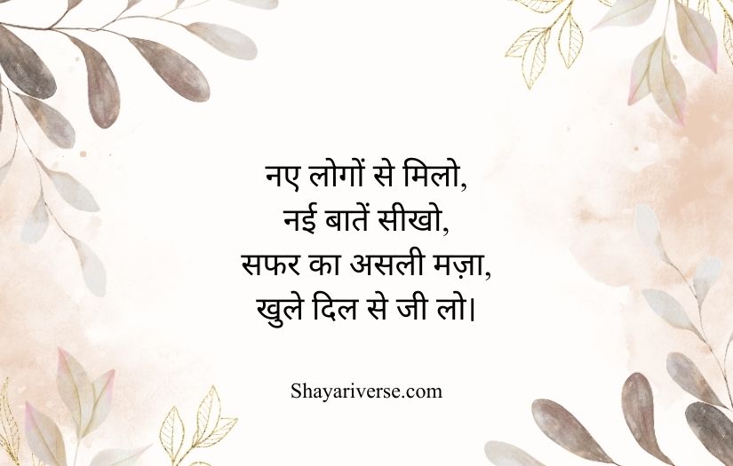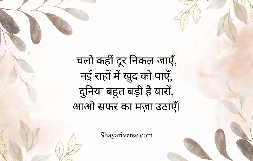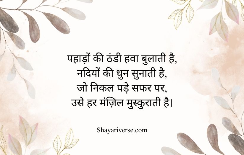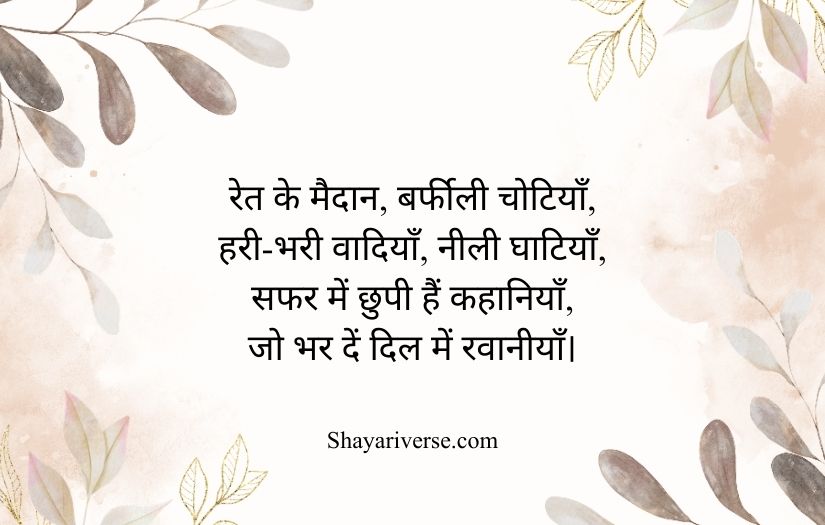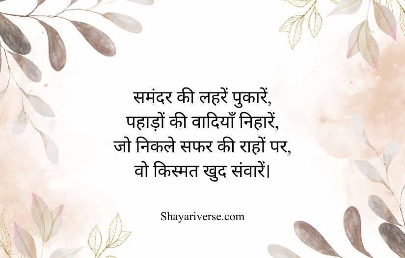 This type of shayari connects with readers by describing the thrill of new destinations, changing paths, and unforgettable memories. It shows how traveling is not just about reaching a place, but about enjoying every moment along the way. Through simple and meaningful words, it inspires people to step out of their routine and explore the world.